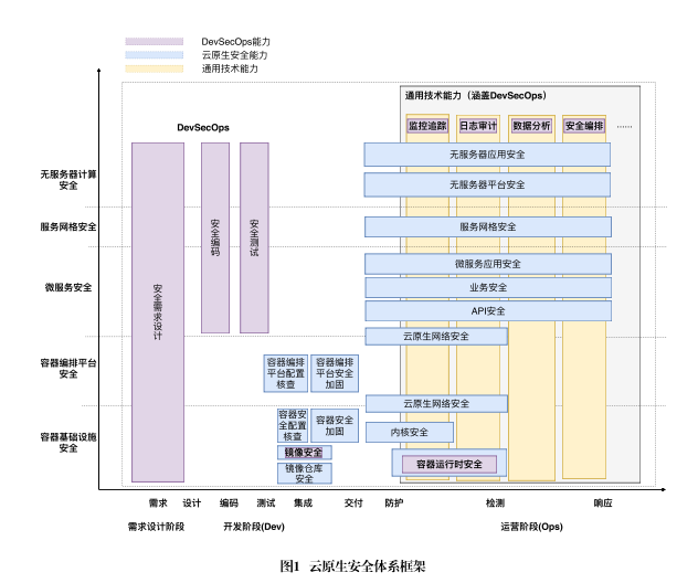 2022年4月,云安全聯盟大中華區(CSA GCR)發布了《云原生安全技術規范》,針對云原生環境下面臨的風險提出了體系化的安全能力要求。如圖1所示,云原生應用安全不僅包括容器基礎設施和容器編排平臺安全,還包括上層的云原生應用安全。云原生場景下服務被拆分成眾多微服務,有些通過服務網格形成了點對點(Ad-hoc)的連接模式,相關的安全機制也出現一些變化,而無服務計算(Serveless)作為云原生場景下的一種創新的計算模式,對應的安全機制與傳統應用、微服務應用也有所不同,因此對應的防護方式相對傳統應用需要做思路上的轉變。
