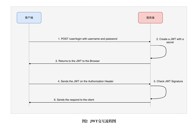為了滿足無狀態登錄,我們可通過JWT實現。JWT是JSON輕量級認證和授權規范,也就是上述流程中提到的令牌,主要用于分布式場景,其使用流程如圖2所示。