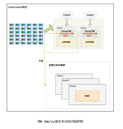 根據近期市場調研,已有幾家公司有了各自的容器化WAF解決方案。以其中一款方案為例,其設計如圖6所示,該方案主要運用了Envoy的過濾器機制(Filter),通過外部授權HTTP過濾器(External Authorization HTTP Filter)可以將流經業務容器的東西/南北向流量引流至WAF容器,從而阻斷惡意請求,保護微服務的安全。