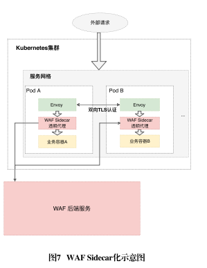 另一種解決方案是K8s WAF方案。該方案基于Istio實現,其中WAF被拆分為代理程序(Agent)和后端服務兩部分,Agent程序作為Sidecar容器置于Pod的Envoy容器和業務容器間,該Sidecar的主要作用為啟動一個反向代理,以便將外部請求流量代理至Pod外部的WAF后端服務中,如圖7所示。該套方案的好處是無須關心外部請求如何路由至Pod,與Istio結合的理念更接近云原生化,實現了以單個服務為粒度的防護。但同時存在不足,例如,流量到達業務容器前經歷了兩跳,這在大規模并發場景下可能影響效率。